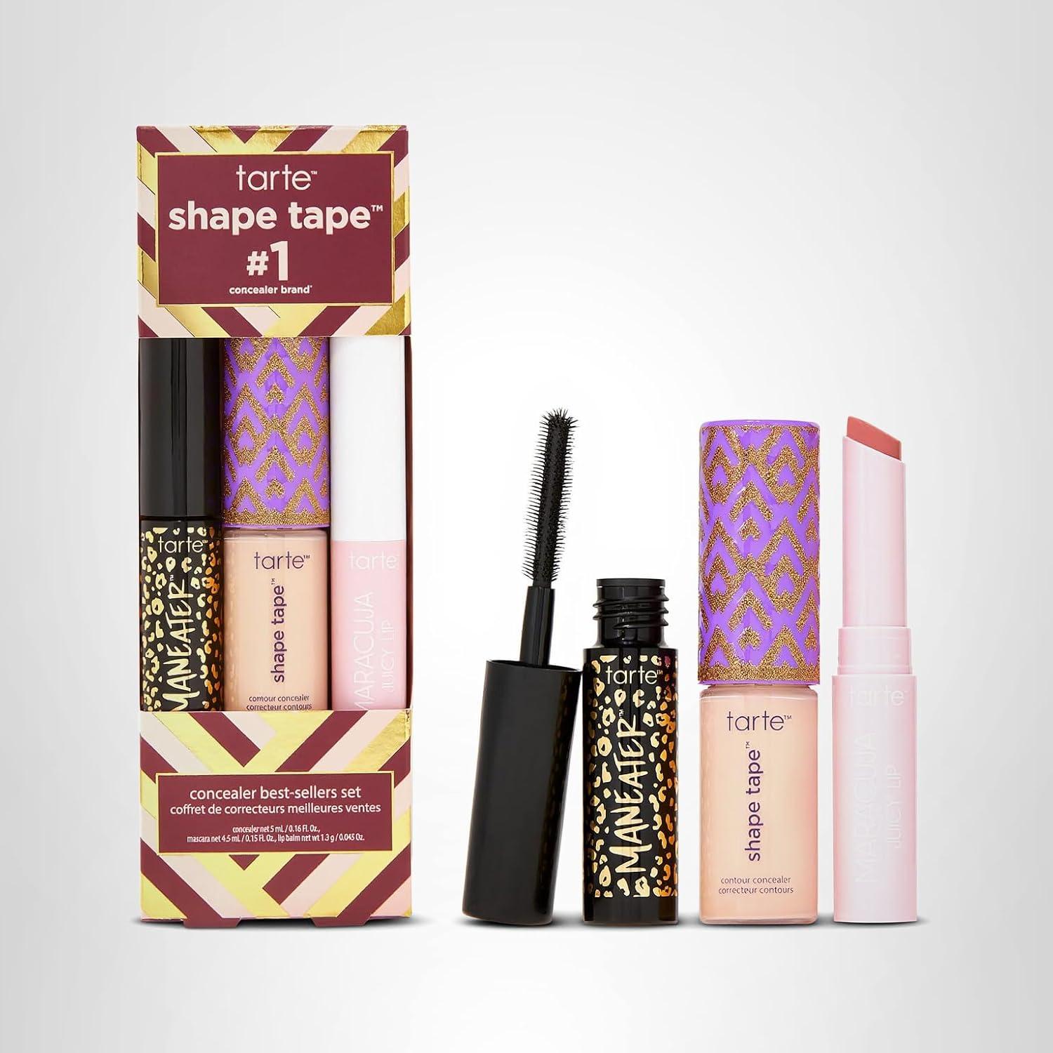 tarte shape tape best-sellers set – Shape Tape Concealer, Hydrating Lip Gloss Balm & Mascara for Curl, Volume & Length, Longwear, Cruelty Free(20B light & rose)