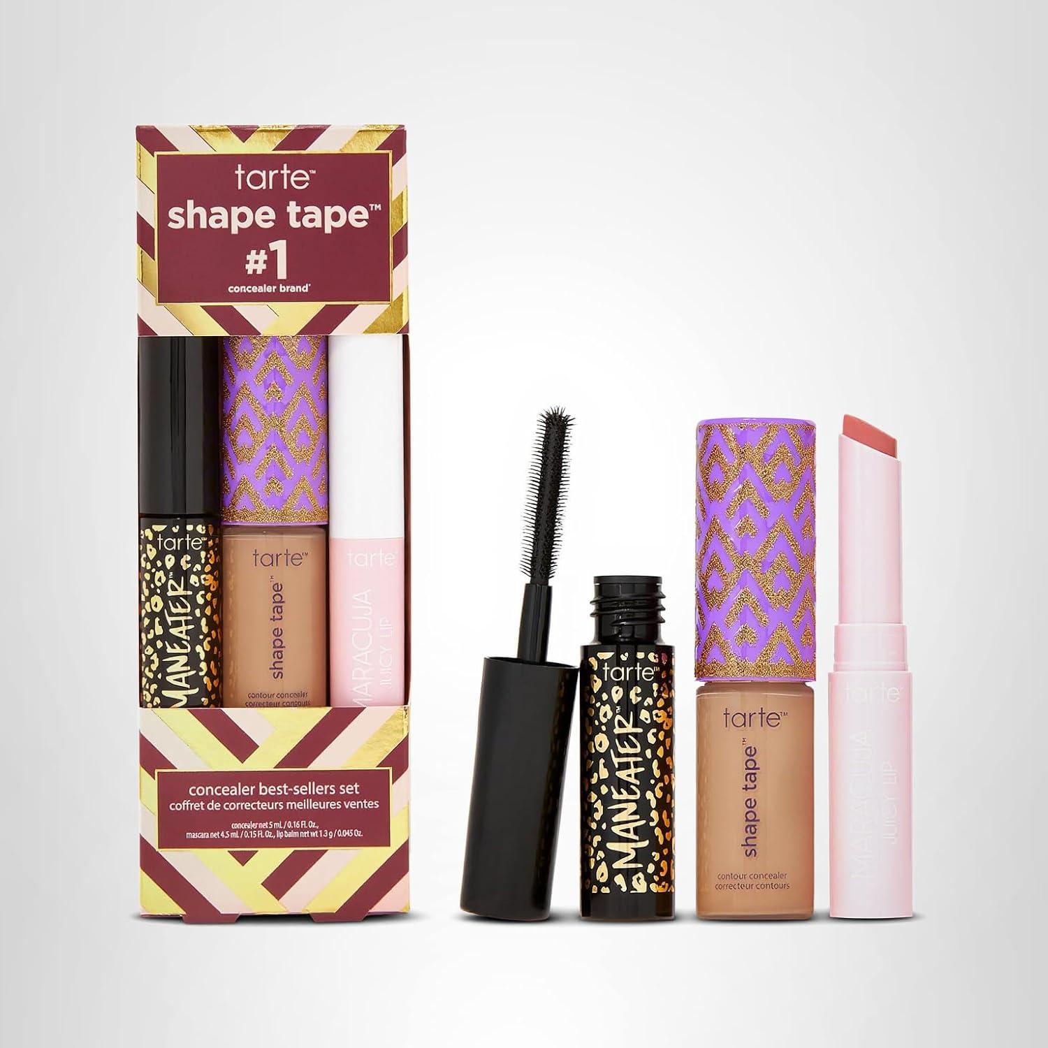 tarte shape tape best-sellers set – Shape Tape Concealer, Hydrating Lip Gloss Balm & Mascara for Curl, Volume & Length, Longwear, Cruelty Free(42S tan sand & rose)